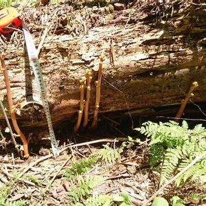 こんばんは🌙🌠 ツチアケビ? でも、こんなにちょびっとのはずはない🤔 誰かが採って行った残り?だと思います😕 ラン科で別名ヤマシャクジョウ オレンジ?銀色に近い綺麗な花を咲かせます。(見てないけど😙) 腐生植物(菌従属栄養植物) 葉っぱがないから光合成をしない。栄養をナラタケなどの菌類に頼って成長するらしいです😗 赤い実は薬用で強壮・強精薬 民間では土通草と呼ばれていて 薬用酒の原料になるらしいです😙