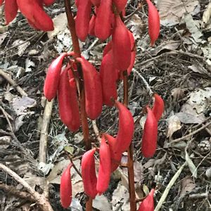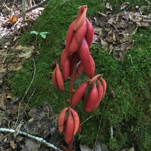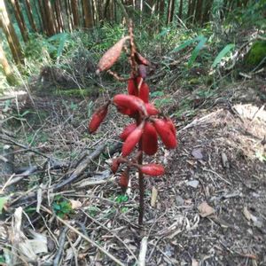ババァ その1/2 歯の無い・・・葉の無い植物 「ツチアケビ(土木通)は、森林内に生育するラン科植物である。ラン科植物として、また腐生植物(菌従属栄養植物)としては非常に草たけが高く、大きな真っ赤な果実がつくので、大変人目を引く植物である。日本固有種。別名ヤマシャクジョウ(山錫杖)」(wiki) 🎉🎉🎉🤣🤣🤣🎉🎉🎉 本気で、いつか真面目に探しに行きたいと思っていた相手に、ヒョッコリと逢えてしまった。嬉しいと言うか、ピンボケの写真を2枚撮って通り過ぎてしまった。何故なのかナ?、気温40度のせいかナ?。せっかく逢えたのにネ、実でなく花ならば、もっとイイのにネ。(8/15)