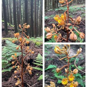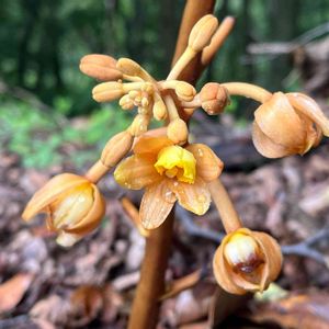久しぶりの低山ハイク🥾下りにて。 山道の脇に目立つ植物を発見👀✨落ち葉たっぷりの湿気た場所です。 全体的に茶系のその植物。内側の黄色いのがお花なんですね🌼という事は蕾の状態がたくさんなのかな。 実は赤く、ミニバナナのような形で特徴的なようです。 ツチアケビと教えていただきました🌿 ・ラン科! ・葉はなく、葉緑素を持たない腐生植物 2023.7.16 東山 兵庫県宍粟市
