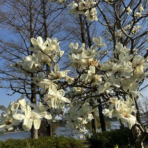 ハクモクレン(白木蓮) モクレン科 同属 1️⃣2️⃣3️⃣上向きの白い大きな花が青空にダイナミックに咲いています 9枚の花びらですが3枚は萼片で、実際は6枚の花びら 至る所で一斉に花開き、2つの高木のものは、見上げると空一面の迫力です 4️⃣咲き始めの花の内部には真ん中に雌蕊が多数、周りに雄蕊が多数ある 内部はピンク色を帯びているものもある 雄蕊は雌蕊を囲んで丸まっている 5️⃣雌蕊は多数が螺旋状に付く 雄蕊も多数が螺旋状に付き、扁平な棒状 花糸にはピンク色の長い葯が張り付いている 雄蕊が開いて横から白い花粉の様なものが見える 4️⃣5️⃣は去年の写真です