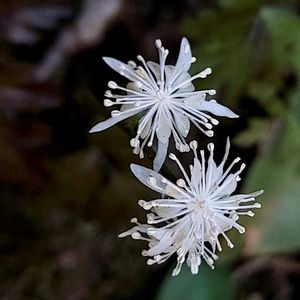 セリバオウレンの両性花です。 ピンク色の葯を持つお花を見たくて出かけました🚶♀️💕🎶 ちょっと時期が遅かった様ですが、 緑の雌蕊がとても綺麗な両性花でした✨🥹💚🎶 キンポウゲ化オウレン属 キンポウゲ科 オウレン属 日本固有種 葉は2回3出複葉で、小葉がセリの葉のように切れ込む。 花は直径1cmほど。 萼片は5〜7個、花弁は8〜10個。 雌雄異株。 雄花は花弁状の萼片が5個、雄しべが多い。 葯は白色。 雌花は紫色を帯び、花弁状の萼片5個、へら状の花弁と雌しべはともに10個ほど。 花柄などが紫褐色を帯びる。
