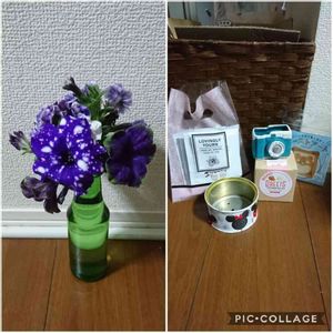 先日ぴーさんから、お礼便が届きました😆💖可愛いリメ鉢や雑貨、ほっこりタイムのお供のお菓子やコーヒーも入っていて、ホント嬉しくなっちゃいました(*´ω`*)💕 ぴーさん、ステキな贈り物をありがとうございました♪ヽ(´▽`)/❤️ そして我が家に咲くペチュニア🌼✨長いところを切り戻して、家の中でも楽しんでいます😆🎵大好きな紫系ばっかりだけど、ナイトスカイがうっとりカラーで癒されるー(о´∀`о)💕