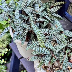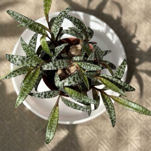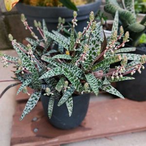 レデボウリア ソシアリス 別名 豹紋 キジカクシ科 レデボウリア属 昨日のハナキリンのpic4枚目にレデボウリアの種が落ちて出た可愛い豹紋のベビーちゃん🐆の親株を3年ぶりで投稿します 5月頃に小さな花を咲かせて こぼれ種から増えるパターンと分球して増えるパターンがあり左側の白い鉢は分球で増えて植え替えました ヒョウ柄、迷彩柄のような葉の模様が特徴的です