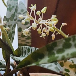 ①何の花でしょハテ(˙˙*)? ②レデボウリア 豹紋 外で冬越し。棚下で元気に咲いてた。①の拡大写真で見ると あーら、何なん、かわいいベル咲なのね🥰 ということで 豹🐆柄祭。 Tシャツ作ってみた。 ③レデボーリア柄。 ④マルモラタス柄。 ⑤ドリミオプシス柄。 あれ?コレ欲しくなった笑 欲しい人〰️🙋♀️笑