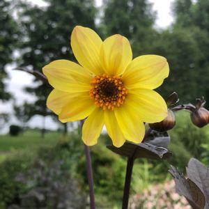 ダリア ミッドナイトムーン 別名ブラックナイト 草丈70センチぐらいに育ちました。 黒葉に黄色い花は まさに名前のとおり🌝