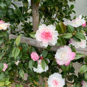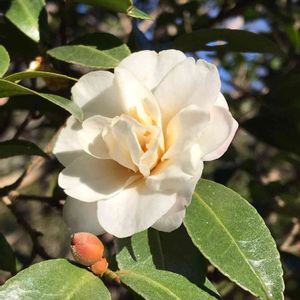 おはようございます😃 花びらの優しい感じの、八重咲きの、白寒椿です。みどりの王国にて。