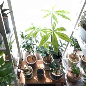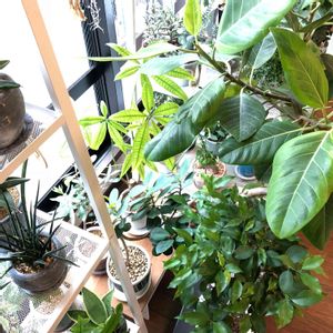 おはようございます(´∀`*) 今日もどんより曇り空☁️ フィカスアルテシマ🌿 わが家では一番大きな鉢に入っていて 剪定を何度もしてサイズをキープしてます そんな中でまた可愛らしい新芽🌱 パキラはDAISO出身の子です ♪ お迎えした時よりも細っそりした感じ? 葉を落としては新しく新芽を出し続けてます それにしてもこのジャングル感…( ´⚰︎` )
