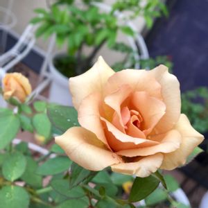 台風の塩害でほとんどのバラが秋の花を見れなくなってしまいました😢 テラスにいて無事だったジュリア 虫に食べられ 夏に疲れて ちょっとちんくしゃ でもバラが一輪咲いただけで庭に火が灯ったよう