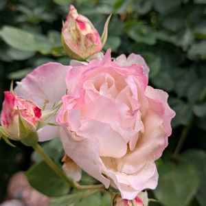 おはようございます☀ 1.クレーフィディアナ本来は赤黒薔薇ですがこの子ピンクと赤の絞り 1番花ほんのりピンクが入りました。マーブルみたいな絞りが入るの楽しみだなぁ♥️💗 2.コンキュサーレ花束みたいに咲います💚 3.ラベンダーピノキオ相変わらずの可愛さ 4.フランボワーズバニーユ 5.手前カレイドスコープ 赤い薔薇は紅玉です 🏷️水曜ローズショー