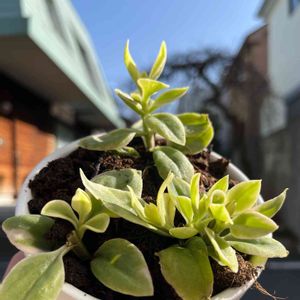 こんにちは!☀️🎶 先日、道の駅で購入したリメ缶に、ミセバヤ&ベビーサンローズを株分けしました。(’-’*)♪