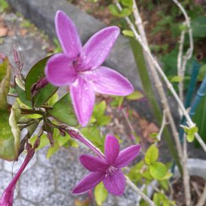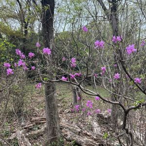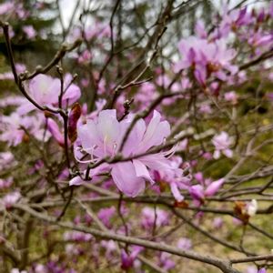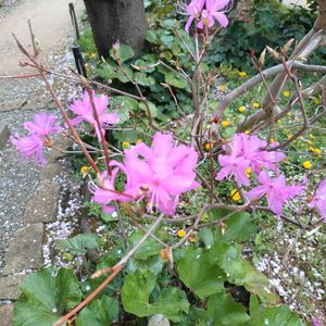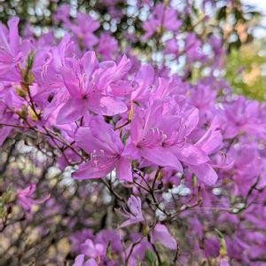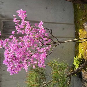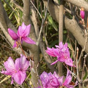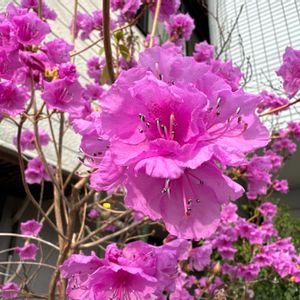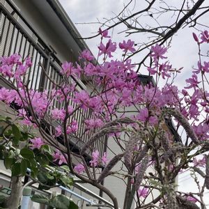 ミツバツツジ 少し遠い公園まで花見がてらの散歩の帰り道、 葉っぱがなくて薄紫がかった蕊の美しいピンクの花だけが宙に浮かぶように咲いていました** *⑅🩷☽︎︎.*·̩͙** *⑅🩷☽︎︎.*·̩͙** *⑅🩷☽︎︎.*·̩͙** *⑅🩷☽︎︎.*·̩͙ お花はどうみてもツツジなのに葉っぱがない不思議‥‥‥‥と思って調べたら、三葉躑躅のようです♡ 「ツツジの中では開花期が早く、4月~5月にかけて葉が出るよりも先に美しい薄紫色の花が開花し、宙に花が浮かんでいるような幻想的な景色を楽しめます」‥とのことで、間違いなさそう🎯 (花後に、名前の由来の「3枚の葉」が枝先に輪生するそうです🌿🔍) 自然樹形が美しく、洋風、和風の庭どちらにもマッチする雰囲気のこのお花、 シンプルでセンスの良いお住まいにぴったりでした🏡✨ 落葉性のツツジのため、秋の紅葉も見ごたえがあるそうなので、いつかご縁があれば、植えてみたい木になりました (家は変わらず😆)🩷💜