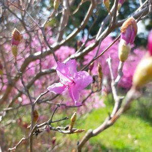 遠目で見ても真っピンク!のツツジエリア(4枚目) 一部、ほとんど蕾で、一つだけ咲いている株を発見💕 蕾は、帽子をかぶっていて、つまむと取れました😊