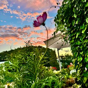 昨日の日没後💭雲が綺麗だった😍 2025.8.17 ①②西洋朝顔の葉っぱ͛.*🍃がワサワサしてますが、まだお花が咲きません😳😅 寄り添うように咲いてるコスモスは 種まきっ子 ③カサブランカが咲きました (前の子は、消えてしまったので、 ピンクと白を植えました😊) 初めましてのカサブランカは、背が低いです(* 'ᵕ' )☆ ④お盆のお買い物🛍のどさくさて見つけた👀コキア。。 今頃植えたので😅大きくなるかしら……🤔 🏷️に、『ご近所やさい🥬』って書いてあったわぁꉂꉂ(ˊᗜˋ*)𐤔𐤔 ⑤🏷️今日のお花 ジニア ヒューケラ達に負けていました🫢