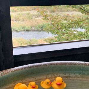 山のみどり、木々、川の流れに癒されて❤️アヒルさん達が山の秘境の温泉♨️に入っています♨️疲れをとって、また、明日からお仕事に学校に家事に、それぞれファイト‼️