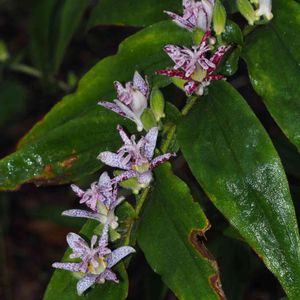 雨の中、ホトトギスを見に行ってきました。 やはりホトトギスは弓形になった茎に整然と並ぶ、上を向いた花が良い。