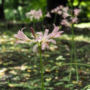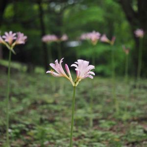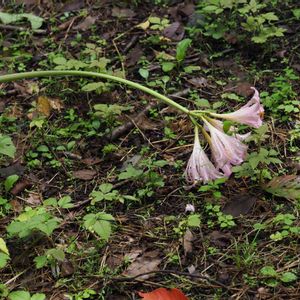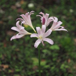 雨に濡れたナツズイセン。 雨の勢いが強すぎてかなり倒伏しています。