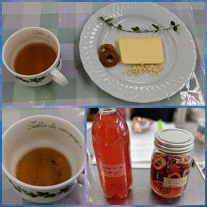 薬膳カフェの講座で自家製のサンザシシロップ🔴を頂いて、実習しました(๑><๑)۶ 「左下」 チーズケーキ soybean風🥮とサンザシ🔴 カッシューナッツ❦ 美味~(๓´͈ ˘ `͈๓).**ꔛ☆* 紅茶のアールグレイ☕️💒💭💕「上」 🌿ハーブのカモミールと陳皮🍊のハーブティー🍵も頂きました( ^^) _旦~~「右下」