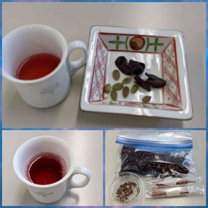 薬膳カフェの講座を受講しました🎶 夏🎐冷たいけど冷やさない工夫、 ハイビスカスのシロップを学びました! プルーン、カボチャ🎃の種の中を頂きました(上)( ^^) _旦~~ お土産に、ハイビスカス、サンシヨウ、シナモン、自家製の無農薬の鷹の爪を頂いたので、シロップを作ろうと思います。(右下) スパイシーシロップ(上)は、そのままでも美味しかったし、炭酸に割って飲んでも美味しかった(๑><๑)۶ (左下)