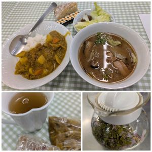 ハーブ教室の実習で、発酵カレールウ作り🍛カレーと発酵スープを頂きましたψ(˶◕؎◕ ˶)ෆ。手づくり🍎リンゴケーキ🥮ローズ🌹とレモンバーベナ🌿ハーブティー( ^^) _旦~~🍵