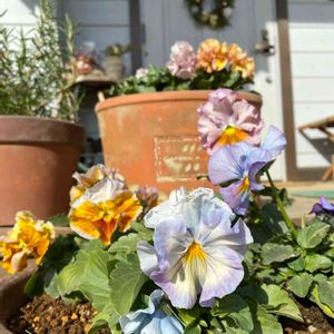 連投お許しをー🙏 春マンボーとリンゴの詞 寄せ植えにしました😍 こんなん寄せ植えって言わないかもだけど🤣 ウエタさんのパンジービオラを仲良く♪ 春マンボーもスイートラブ同様去年から先輩ガーデナーさんのpicをみて育ててみたかったお花です🥰 うまくいくかなードキドキ 2つとも色幅があるようです かわいいのだ💕