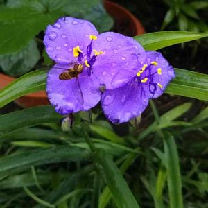 お疲れ様です😃 雨の昼下がり 🐝が、ムラサキツユクサで ランチを楽しんでました😊
