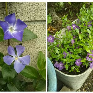 お疲れ様です😃 写真左 ツルニチニチソウです。 毎年のように大暴れしますが 今年は、やけに大人しいです😅 写真右 2度目の出演 ヒメツルニチニチソウです。 プランターの中で ツルが伸び放題だったので 久しぶりにバッサリとカットしたら 急にガンガン咲きだしました😅
