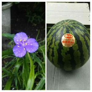 お疲れ様です😃 今日は気温は低いですが 雨でムシムシでした😵💦 雨といえばムラサキツユクサ💜 今日も咲いてました☺️ 実家から届いた尾花沢スイカ🍉