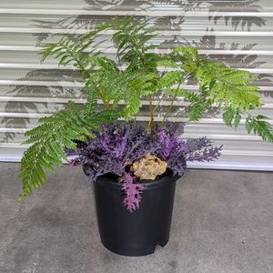 買い出しついでに葉ボタン見繕ってるオカンに釣られて、初めて自分のを買ってみた🤭 紫の切れ葉とシダを合わせて『魔界植物』っぽい感じに🤭 なかなか気に入った雰囲気の鉢になった〜😆🙌