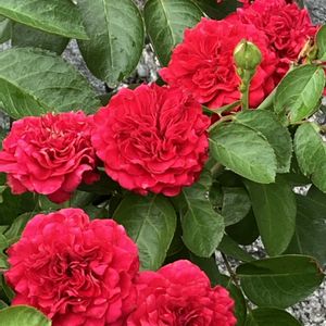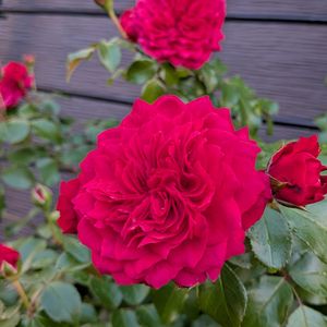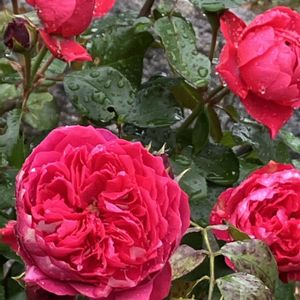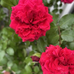 先日の大ヤマセに折れた花枝は1つだけ。強いぞ!レッドレオナルドダヴィンチ✨花が次々咲いてきました。 アップて全体像載せてます。 レッドレオナルドダヴィンチはフロリバンダとかクライミングとか、シュラブとか分類が分かれてるけど、うちではフロリバンダかな🙄シュート更新はせずに枝が太るタイプのようです。