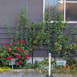車庫横の花壇に半地植えで大きな鉢を少し埋めてバラを植えてます。 キングローズのシュートの乱立ぶりをご覧ください😁もうシュートを支えるグラスファイバー支柱が足りないし、立てるスペースもない💦あとから伸びてるのは斜めに誘引したりして誤魔化してる。 ここにきて更に株元の古枝からベイサルシュート発生😳間に合うんだろうか⁉️