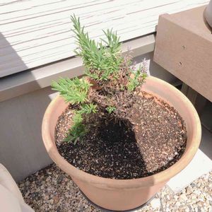 先月購入したラベンダー💠 購入した時は綺麗に咲いていたのに 1度剪定した後、なぜか花が茶色に…🤔 原因が分かる方いらっしゃいますか? 土は購入店で勧めてもらった培養土で 陽が当たる午前中だけ日光浴させています☀️5時間ほど。 肥料は植え替えの時に緩性の置肥をしました💡 水やりは渇いたらたっぷりあげる感じです。今は2日に1回くらい。 アドバイスお願いしますm(__)m