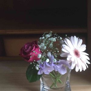 火曜日買ったお花です ガーベラが最後の1本 なんと初めてのガーベラでした 残り物に福ありでした👍 セロファンとったら またクルっとなったので 無理やり真ん中には持ってきて 花びらなんとか伸ばしました
