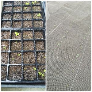 白菜の発芽率が悪すぎて😫別のポットに撒き直しました。 青梗菜と小松菜は播いて3日しか経っていないのに綺麗に発芽。 寒冷紗の外からなのでちょっと見にくいですね😅
