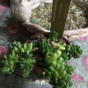 愛智園の『リトルジェム』。 リトルジェムさんはセダム属の多肉植物になります(^^) とても小型で、紅葉期にはしっかり紅葉してくれます(*´꒳`*) 水を控えめにして日光にたっぷり当ててあげると紅葉しやすくなります(*^▽^*) また大きくなるとすぐに群生していきます(*´꒳`*) 育てるにあたり注意点があるとすればリトルジェムさんは徒長しやすい子です。なのでちょっとでも日光が不足するとすぐに伸びてきます(><) ですが夏の直射日光を除いてしっかり日光にあててあげれば健康に育ってくれます(^^) 小さくてかわいい多肉植物さんに出会いたいという方はリトルジェムさんいかがでしょうか(*´꒳`*)