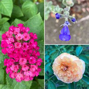 雨上がり 左 ランタナ 右上 ブルーサルビア 右下 ミニ薔薇 鮮やかな色💕💕💕