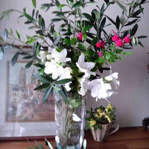 今日のお花係で活けたものその1🌸 芍薬は雨に濡れて全んど散ってましたが 一輪小さなお花が咲いて最後の一輪を義母さんに見てもらえるようにと摘みました。 紅白斑入りのサザンカと白と紫のライラックが咲きそれもドドーン…と欲張りそうになるとこを抑えて… 復活祭のオリーブの枝と共に活けました。