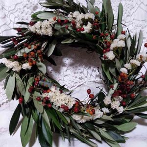 やっと オリーブのリースが できました。🌿🌿 平和と安らぎの象徴 オリーブ🌿 ウクライナに平和を! 日赤より 心のケアを含めて 医療派遣 スターチスの白と バラの赤い実を使って🌿