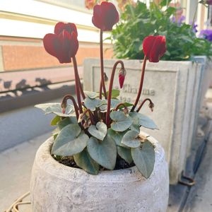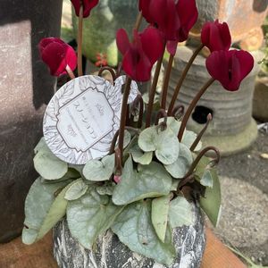 おつとめ品でお迎えしたスノーショコラが、もりもりと花を咲かせてくれています🥰 シクラメンとしては珍しいシルバーリーフに、シックな赤い花が映えてとても美しい 大好きなお花のひとつです♪