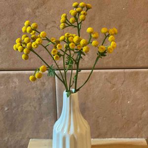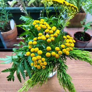 タンジー キク科 ヨモギギク属 舌状花が無く黄色い頭状花序が目立つハーブです。 葉は樟脳のような香りで防虫効果があるそうなので生ける時に切り落した葉を束ねてお部屋に置いてみました🌿
