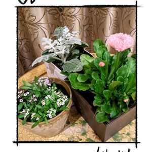 こんばんは🌛 以前に作った寄せ植えで枯れてしまって空いてしまった隙間に植えようと買ってきた 白妙菊 チロリアンデージー アリッサム 二日目もこちらの部屋にご滞在 寒くなってきて…庭に出られない❗😞 ポットのまま小さな植木鉢と空缶に入れてみたらかわいい❗〜😄 このままでも………(*^^*)