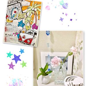キングバンブー☘️が折れてしまったので水挿ししてたら根が出てきました😊 淡いピンク色のカーネーションが可愛い🌸 8月のカレンダーが可愛いかったので一緒に載せました💐 雨☔️ですね。被害がこれ以上大きくなりませんように。 皆様、気を付けてお過ごし下さい🙏