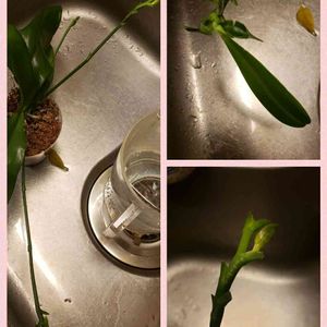 シレリアナの一株。 右の太いのが花茎かと思っていたのだけど、ずっと動きがなく、左の貧相な別の花茎が伸びてきて。左の貧相な方は蕾がついてきたので花茎確定として、右の動きがない逞しい花茎っぽいのは何?🤔高芽を出そうとしているの??謎だ😅太さが全然違うし😅