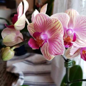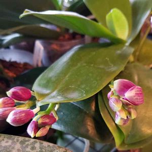 一昨日、黄色に筋膜入りの胡蝶蘭とともにお持ち帰りした、ワンコイン名無しの胡蝶蘭さん😊、開花途中。 これは、リトルジェムストライプかなぁ?咲いてみないとわからないけど、そんな気がするなぁ。 胡蝶蘭はコロコロした蕾が開く直前が可愛い。カトレアは緑だった蕾が、花開く直前にぷっくり大きくなり急に蕾の色が鮮やかに変わるのが魅力的。 咲いた花ももちろん美しいけれど、ランの🌿🌿花開く一歩手前の状態が一番こころ惹きつけられるかも😳💕