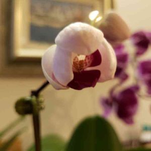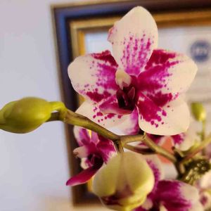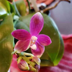 名無しの胡蝶蘭さん😊 花の下に蕾が。もう一輪咲くかな? この子は成長点が完全にやられているので、花が終わった後、高芽もしくは子株を出してもらうために少しばかり策を講じる必要があります🤔🌿🌿