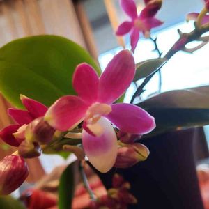 胡蝶蘭 満天紅さん😊 胡蝶蘭では他にも似た色を持つ品種があるけれど、なんで満天紅が愛されるのか分かる気がする。表現が下手だけど可愛らしい花の形状にクリアな発色というか。かといって、派手すぎる佇まいでもなく。 私の中では中国歴史ドラマの中の美しい着物を着た若い娘さんみたいなイメージ(←仕事からの現実逃避でAmazonで歴史ドラマの見過ぎか😂🌿🌿)