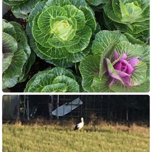 紅白の葉牡丹植えました 正月にはだいぶ早いけど😅 立ち上がると 前の田んぼに鶴⁉️ いい事ありそう😃 遠くて見づらいけど名前教えて下さい 1m以上 頭や首は白い 尻尾の方だけ黒 草花でなくてすみません🙇♂️