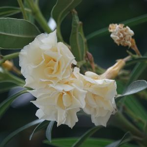 夾竹桃 毎年たった一つの花しか見た事が無かったのに、たくさんの花を咲かせていました。既に盛りは過ぎていましたが会えて嬉しいクリーム色のキョウチクトウ めまいのするような暑さの中、歩いた価値はありました