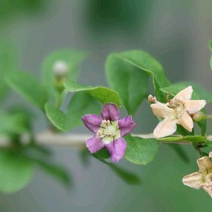 クコ(枸杞) ナス科クコ属 落葉低木 在来種 咲き始めはピンク色で、終わり頃には黄色っぽくなります。 赤い実になるのも早く、花と実は冬近く迄、見られる、長く咲き続ける花。