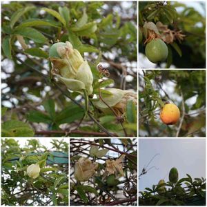 不法侵入した敷地の柵に⁉️な実が‼️ AIによるとパッションフルーツの仲間? 淡いクリーム色のお花の痕跡も残っていますが