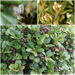 工業団地の植栽のたくさんのシャリンバイの実が 巨峰のようです。 驚いた事に花を付けている木もたくさんあります